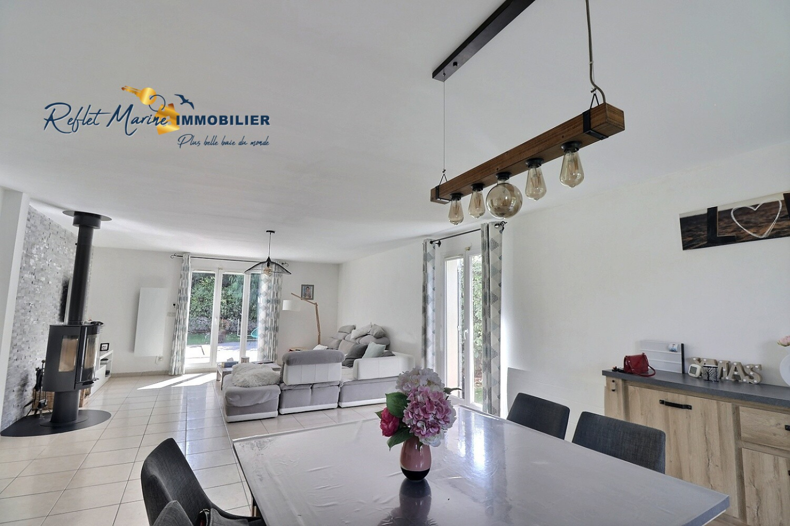 Un séjour lumineux de 57 m², sublimé par un poêle à bois, idéal pour les moments de convivialité